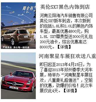 導(dǎo)語映象網(wǎng)汽車頻道,為了給廣大愛車人士提供更多的車市信息,創(chuàng)辦了車市行情欄目,欄目提供中原車市各大4S店的打折信息、活動等信息,為您購車、選車、試車做向?qū)А?/FONT>