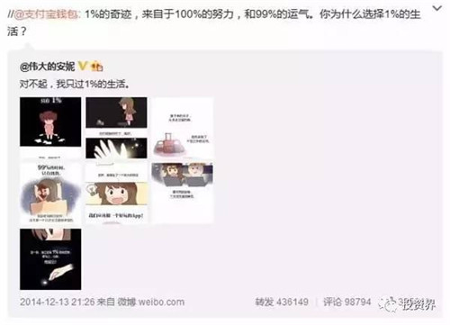 這條漫畫以陳安妮自己為主角,講述的是她在別人認(rèn)為只有1%成功可能的情況下,堅(jiān)持畫畫、創(chuàng)業(yè)、做APP的故事。漫畫推出隨即大熱,“姚晨轉(zhuǎn)了,趙麗穎也轉(zhuǎn)了”,在短時間內(nèi)就達(dá)到了45萬轉(zhuǎn)發(fā),閱讀人數(shù)超過2億。