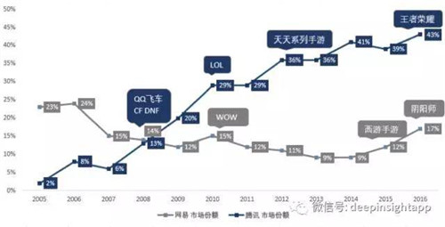 基于公司的財報和艾瑞的數(shù)據(jù),我們做出了兩家公司在游戲市場份額的變化趨勢,2008年是一個明顯的轉(zhuǎn)折點,這一年騰訊開始超越網(wǎng)易,2008-2010年三年的時間,騰訊通過LOL、DNF、QQ飛車、CF等爆款把游戲市場份額從6%提高到了接近30%。