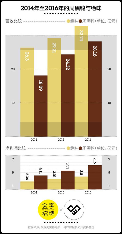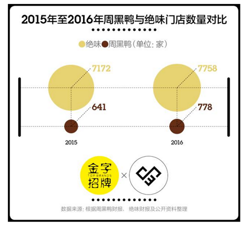 近兩年的市場(chǎng)表現(xiàn)沒有讓潘攀失望。根據(jù)咨詢公司弗諾斯特沙利文的數(shù)據(jù),中國休閑鹵制品零售總額從2010年的232億元增長至2016年的637億元,年均復(fù)合增長率為18.5%。截至2016年12月31日,周黑鴨全年?duì)I收約為28.16億元,較去年同期的24.32億元增長15.8%。雖然778家的門店數(shù)量只有絕味的1/10左右,但周黑鴨的利潤率是絕味的2倍多。