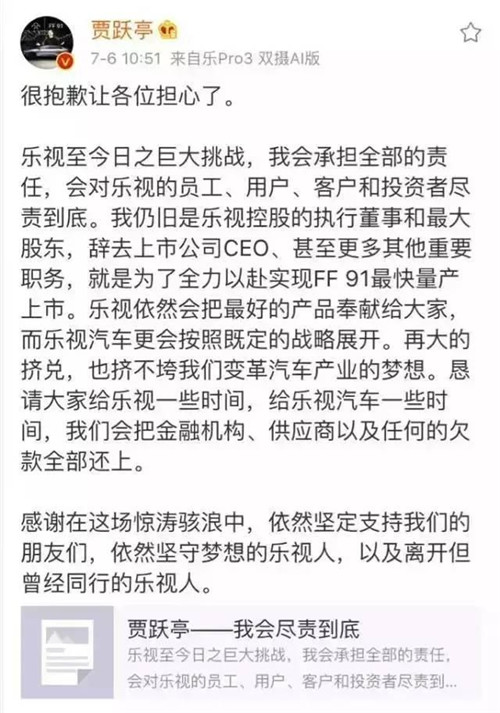 2、辭任之前賈躍亭剛發(fā)了道歉信,說(shuō)會(huì)負(fù)責(zé)到底