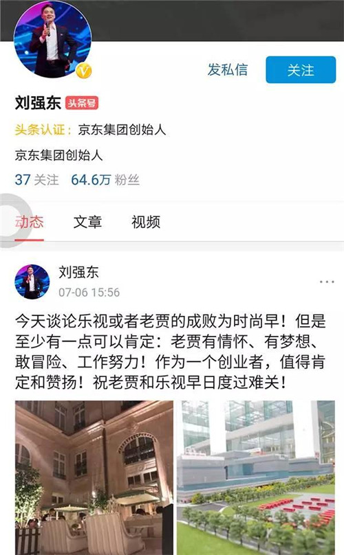 京東集團(tuán)創(chuàng)始人劉強(qiáng)東在個(gè)人認(rèn)證頭條號(hào)對(duì)樂(lè)視表示聲援,劉強(qiáng)東稱:今天談?wù)摌?lè)視或者老賈的成敗為時(shí)尚早!但是至少有一點(diǎn)可以肯定:老賈有情懷、有夢(mèng)想、敢冒險(xiǎn)、工作努力!作為一個(gè)創(chuàng)業(yè)者,值得肯定和贊揚(yáng)!祝老賈和樂(lè)視早日渡過(guò)難關(guān)!