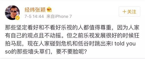 那些堅(jiān)定看好和不看好樂(lè)視的人都值得尊重,因?yàn)槿思矣凶约旱挠^點(diǎn)且不動(dòng)搖。但之前樂(lè)視發(fā)展很好的時(shí)候狂拍馬屁,現(xiàn)在人家碰到危機(jī)和低谷時(shí)跳出來(lái)I told you so的那些墻頭草們,要不要臉呢?