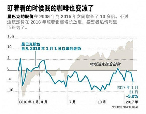 就連舒爾茨本人也說(shuō),星巴克的股票走勢(shì)有些不穩(wěn)。從2009年起到2015年,公司的股價(jià)增長(zhǎng)了1,170%,而在2016年則跌去了8%,這是自從2008年以來(lái)的首次下跌—盡管大盤上漲了10%。令人沮喪的是,下跌竟然找不到很明確的原因。有些懷疑指向了銷售增長(zhǎng)放緩、舒爾茨(第二次)宣布從首席執(zhí)行官的位置上退休后領(lǐng)導(dǎo)層的不確定性、甚或是這家總部位于西雅圖的公司制定了依靠海外市場(chǎng)的發(fā)展計(jì)劃,而特朗普?qǐng)?zhí)政后給跨國(guó)經(jīng)營(yíng)帶來(lái)了不確定因素。