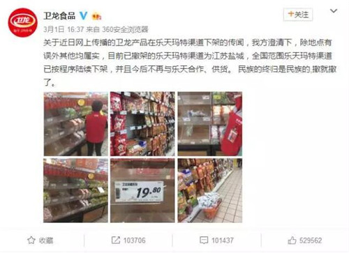 衛(wèi)龍表示,已在全國(guó)范圍從樂(lè)天瑪特渠道下架自家產(chǎn)品,斷絕與樂(lè)天的合作關(guān)系,并稱(chēng)“民族的終歸是民族的,撤就撤了”。
