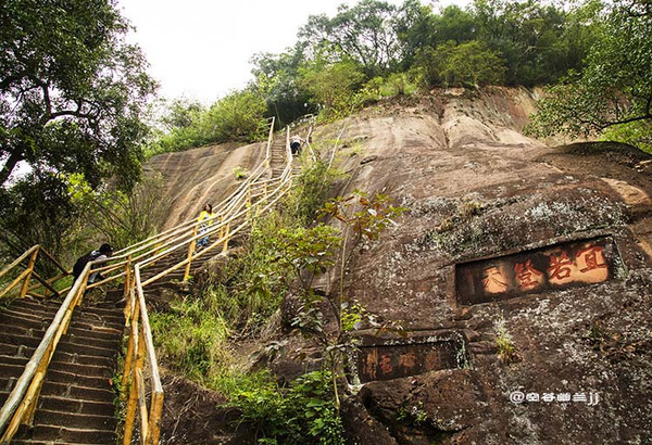 丹梯鐵鎖位于中層風(fēng)景區(qū)至山頂?shù)膽已虑捅谏希陆印昂粑ㄌ臁?。原中層到上層,本無道路可通,后來經(jīng)人工在這里開鑿石階,旁邊輔以鐵鎖鏈,方成通道,并以“丹梯”命名。