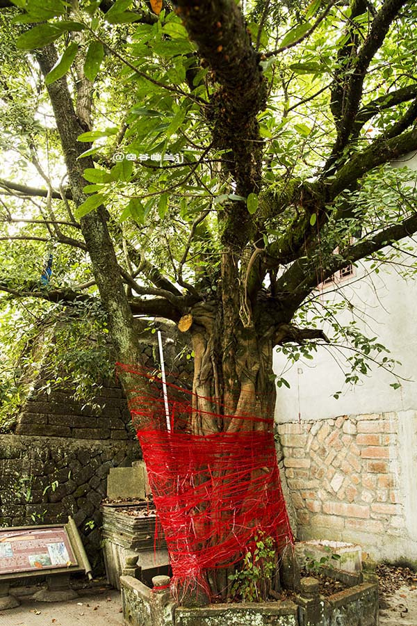 鴛鴦樹生長在六祖堂舊址旁邊。遠(yuǎn)看,它婷婷玉立如一體,枝葉婆娑不分彼此;近看,則可辨清樹干一里一外,兩種不同科目的樹相互依存。一株四百多歲的百日青,一株一百多歲的筆管榕,它們的樹葉交錯,各現(xiàn)姿容,好象久別重逢的情侶,互相擁抱著站立在幽靜的山谷間。