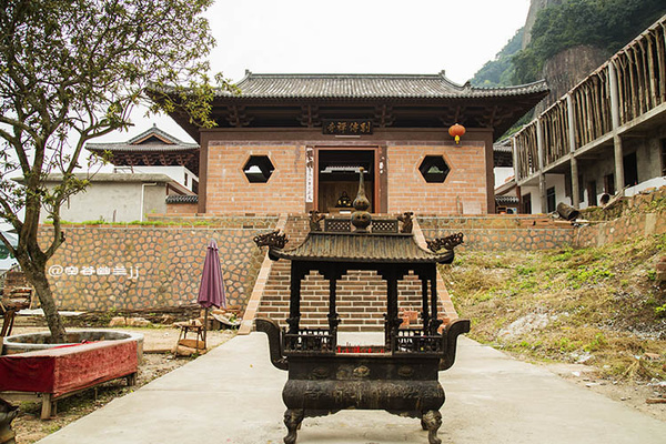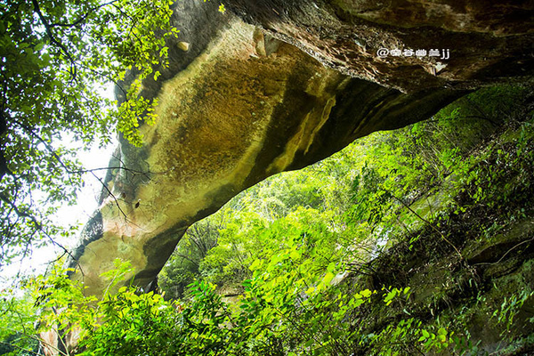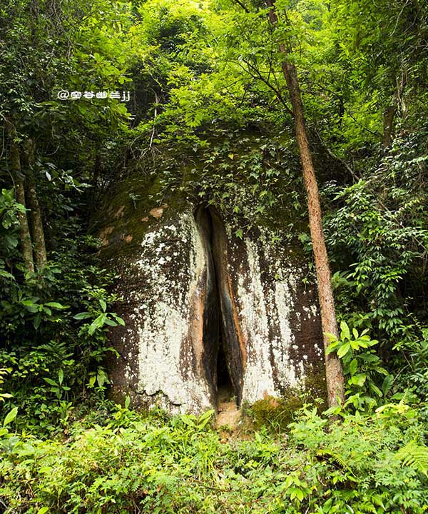 福音峽。這里懸崖相依,兩山并立,相距不過數(shù)尺,遠(yuǎn)觀之則只見藍(lán)天一線自峽中露出,故名“一線天”。右邊一石,形如草鞋。據(jù)說:人立在峽中,面向南大喊,若有四聲回音,則此人將有福緣,故此峽名“福音峽”。