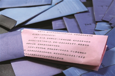 而最棘手則是一些父母與孩子之間有一些矛盾,“我們班一個男生因為高中時候爸媽管他管得太緊,以至于跟他們之間產(chǎn)生了很大的矛盾,他的父母知道有這樣一個可以給孩子寫信的機(jī)會之后,雖然很高興,但是也憂心忡忡,害怕孩子不愿意看他們的信,或者會因為這封信措辭不合適而加深對他們的誤解。我開導(dǎo)了他們很久,他們才愿意寫一封信,希望可以解開這個心結(jié)?!标惱蠋煴硎?,這位同學(xué)的父母寫的信更像是一封和解信,在字里行間的深深愧疚中,她也感受到了家長對于孩子的無奈和那一顆期望孩子快樂的心。