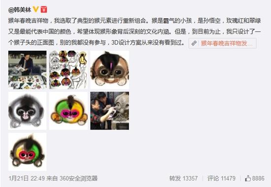 春晚吉祥物康康由“福娃”的創(chuàng)作者之一韓美林設(shè)計,官方稱是以中國傳統(tǒng)水墨畫的藝術(shù)形式,生動表現(xiàn)出“猴”的機靈活潑特點。看看韓老師的手稿,也是能get到喜慶的氛圍和毛茸茸的手感,還算是只討人喜愛的猴子↓
