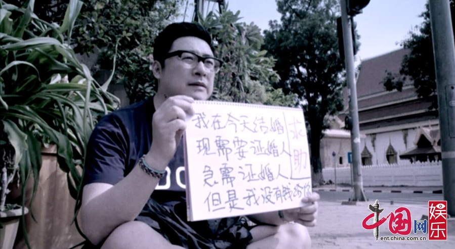 該片段中,王岳倫變身“落魄浪人”,獨(dú)自坐在老撾的馬路邊,手舉中文告示牌急求證婚人,然而車水馬龍的街頭并沒有人為他停下腳步,最終王岳倫被折磨得精神奔潰,只能對(duì)著天空大喊:“證婚人!你在哪!”