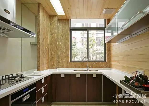 U型櫥柜設(shè)計(jì)儲(chǔ)物功能大,左邊吊柜統(tǒng)一采用開(kāi)放柜與封閉柜不僅美觀,而且方便擺放和儲(chǔ)藏物體,棕色背景與面板形成呼應(yīng),使空間更為溫馨、自然。