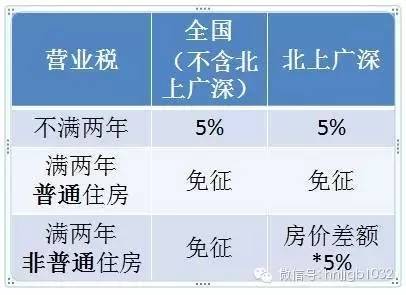 但“北上廣深”四個(gè)一線城市暫不實(shí)施,也就是說,北上廣深在營(yíng)業(yè)稅政策方面仍實(shí)行財(cái)稅〔2015〕39號(hào)文,即個(gè)人購(gòu)買不足2年的住房對(duì)外銷售的,全額征收營(yíng)業(yè)稅;個(gè)人購(gòu)買2年以上(含2年)的非普通住房對(duì)外銷售的,按照其銷售收入減去購(gòu)買房屋的價(jià)款后的差額征收營(yíng)業(yè)稅;個(gè)人購(gòu)買2年以上(含2年)的普通住房對(duì)外銷售的,免征營(yíng)業(yè)稅。