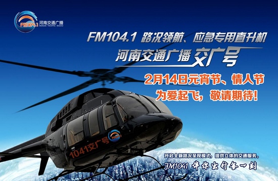 2月14日,河南交通廣播將送來“中西合璧情人節(jié)”重磅大禮——“向愛說sorry”交廣號私人定制浪漫情人節(jié)。當天,1041交廣號直升機將再次為愛起飛,全景呈現(xiàn)省會鄭州交通路況,并聯(lián)合二七萬達廣場,提供情人節(jié)私人專機浪漫飛行,現(xiàn)在參與河南交通廣播節(jié)目微信互動,就有機會和你的TA坐上1041交廣號專機,獨享二人世界,不妨來一場浪漫的空中求婚儀式。