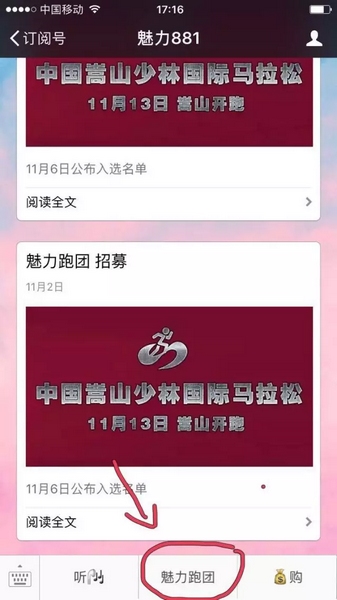 如果你想?yún)⒓颖敬伪荣惖?公里跑項(xiàng)目,請(qǐng)?jiān)邝攘?81微信公眾平臺(tái)點(diǎn)擊菜單“魅力跑團(tuán)”回復(fù)以下信息: