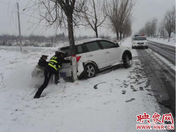 登封交警大隊(duì)從1月3日晚上開始,就組織警力百余人在路面上不間斷巡邏,救助拖移壞車9輛。