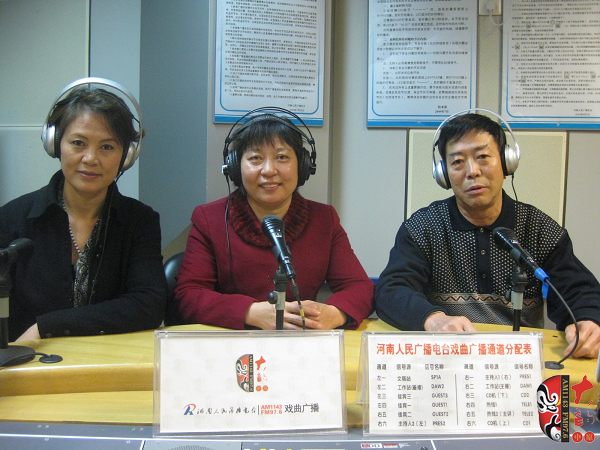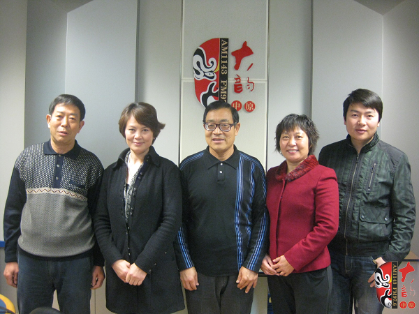 (左起):梓軒藝術(shù)團(tuán)主任聶衛(wèi)國、副團(tuán)長兼主要演員李風(fēng)莉、團(tuán)長李春友、主任魏桂愛和著名戲曲節(jié)目主持人戲曲廣播“當(dāng)家小生”月陽在直播間