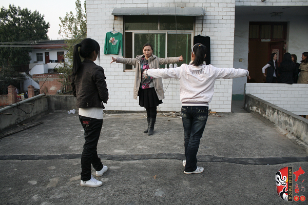 稍有空余他們就自覺的練功,圖為劉粉霞在為學(xué)生演示動作