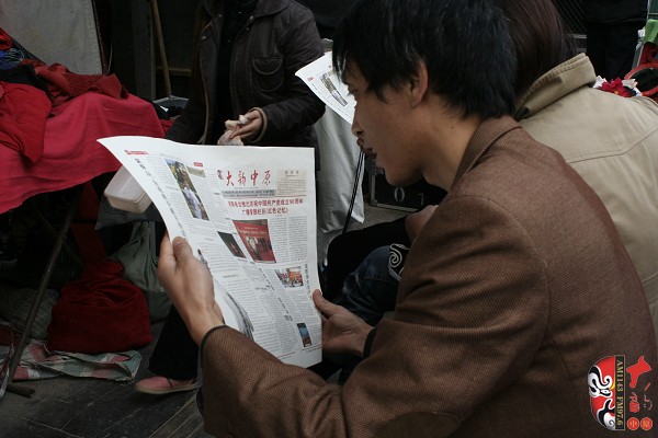 劇團演員認真閱讀河南電臺戲曲廣播《大韻中原》報紙