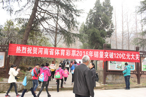2017年1月1日元旦佳節(jié),“中國體育彩票”全國新年登高健身大會(huì)(華中主會(huì)場)暨信陽新年登雞公山健身大會(huì)“精彩開幕,來自社會(huì)各界的3000余名群眾、體彩代表及健身愛好者參加活動(dòng)。新年登高意義深遠(yuǎn),在參與全民健身鍛煉體魄的同時(shí),還能帶來美好的希望。在協(xié)辦單位河南省體育彩票管理中心的指示下,體彩信陽分中心組織了80名網(wǎng)點(diǎn)業(yè)主組成代表隊(duì)參賽,并在開幕式現(xiàn)場舉行了多種形式的宣傳活動(dòng)。