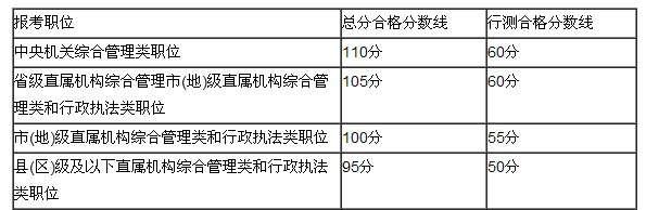 其中,報考中央機關綜合管理類職位的合格分數(shù)線較去年相比有所提高,總分不低于110分,且行政職業(yè)能力測驗不低于60分。分數(shù)線劃定如下表: