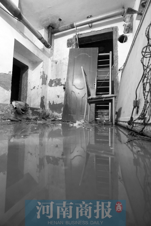 在負(fù)一樓,潮氣更重,地面上橫七豎八地擺放著很多雜物,循著滴水聲向上看,一節(jié)生銹的水管道外壁上沾滿了水珠,水珠不停地往下滴。地面一側(cè)便是電梯井,記者打開燈照進(jìn)去,發(fā)現(xiàn)里面還有一些積水。