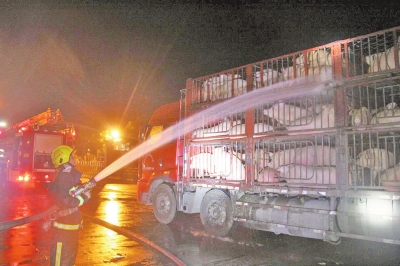 300頭豬被困高速口吐白沫 消防員噴水搶救