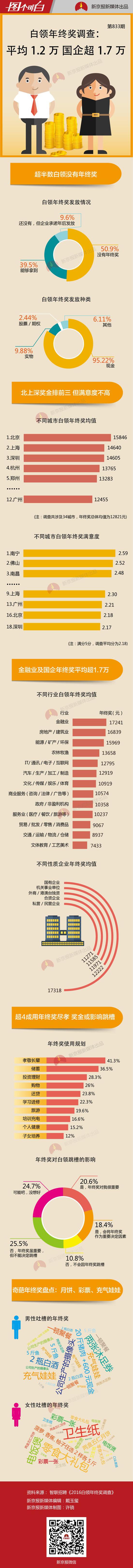 春節(jié)將至,“年終獎”又成了眾人關(guān)注的話題。近日,智聯(lián)招聘發(fā)布《2016白領(lǐng)年終獎?wù){(diào)查》,調(diào)查通過對11526份有效問卷分析顯示,涉及的34城市年終獎總體均值為12821元。其中,北京最高,為15846元,上海和深圳次之。不過,三個城市的白領(lǐng)對年終獎的滿意度并不是很高。