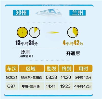 據(jù)鄭州東站工作人員介紹,即日起鄭州東站每天將有18趟往返蘭州的高鐵列車(chē)(具體列車(chē)車(chē)次、開(kāi)行日期以12306網(wǎng)站以及車(chē)站公告為主),其中始發(fā)高鐵列車(chē)3趟。鄭州到蘭州最快的車(chē)次為G97,從鄭州車(chē)站至蘭州西站,中間經(jīng)停西安北、天水南站,全程僅需4小時(shí)42分。這較之前最快的Z265次列車(chē)足足縮短了將近8個(gè)小時(shí)。