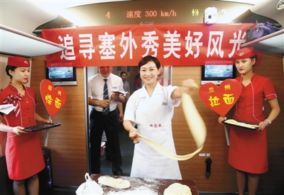 為了慶祝首發(fā),李惠萍帶領(lǐng)幾名高姐,策劃了各種小環(huán)節(jié)來(lái)和旅客互動(dòng),現(xiàn)場(chǎng)做燴面、拉牛肉面,整個(gè)車(chē)廂熱熱鬧鬧。