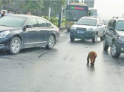 記者隨后致電鄭州市林業(yè)局野生動(dòng)物救護(hù)站求助。在等待的過程中,這只“美猴王”引來不少市民圍觀,有市民拿出手機(jī)靠近拍照,“美猴王”猛地躥出,嚇得拍照的市民連退幾步。見人群漸多,“美猴王”坐不住了,跑到了商都路的快車道上,過往車輛見狀紛紛躲避(如圖),幾位巡防隊(duì)員在后面跟著,提醒車輛注意,但跟得緊了,“美猴王”還一度回過身來,試圖撲咬巡防隊(duì)員。
