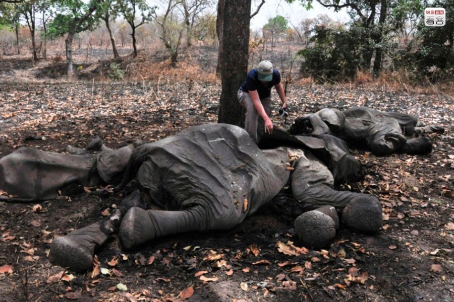 1989年,聯(lián)合國(guó)CITES公約全面禁止象牙貿(mào)易,以遏制非洲大象被大規(guī)模殺戮的趨勢(shì)。但象牙走私、販賣的巨額利潤(rùn)使得偷獵活動(dòng)屢禁不止。有調(diào)查認(rèn)為,中國(guó)是非法象牙貿(mào)易劇增的最重要因素。圖為一名國(guó)際愛(ài)護(hù)動(dòng)物基金會(huì)成員在喀麥隆森林公園檢查一頭遭受獵殺的大象。截至2012年1月,當(dāng)?shù)丶s300-400頭大象被獵殺。CFP