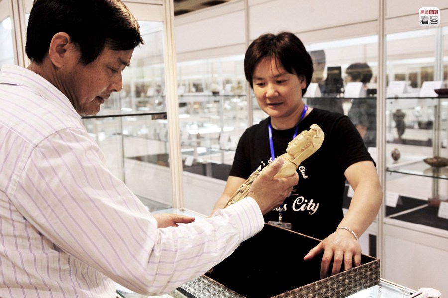 中國(guó)對(duì)象牙市場(chǎng)采用收藏證和特許經(jīng)銷制度,象牙制品一對(duì)一配有國(guó)家林業(yè)局頒發(fā)的收藏證。但中國(guó)一半以上的合法象牙加工銷售企業(yè)牽涉非法貿(mào)易,將走私象牙“洗白”。圖為2010年6月30日,杭州,一名收藏愛(ài)好者在西泠春拍預(yù)展上查看一件象牙工藝品。CFP