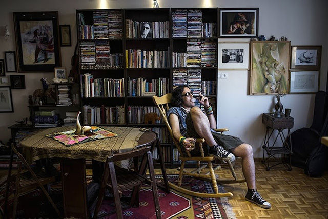 本土藝術家Eylya在他房間內抽煙喝酒。