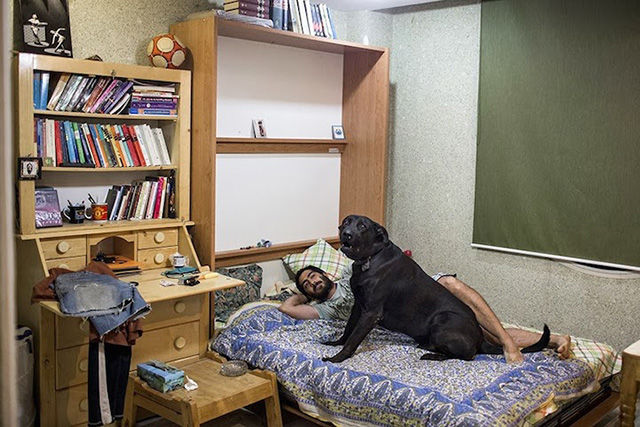 一名男性和他的狗在房內休息。狗在這里是不潔的,一般都不是寵物,而且由主人關在房間內。