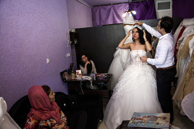 在一個婚紗店里,一名男性在幫一名女性調整頭飾。一名不相關的男性和女性在這種情況下是被禁止呆在一起的,這件裙子擺放在店內的某個角落,從大街上是看不到的。