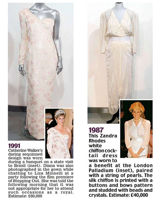 右:Zandra Rhodes白色雪紡禮服。1987年5月,戴安娜王妃穿著這條禮服在倫敦出席公益活動(dòng)。估價(jià):4萬英鎊