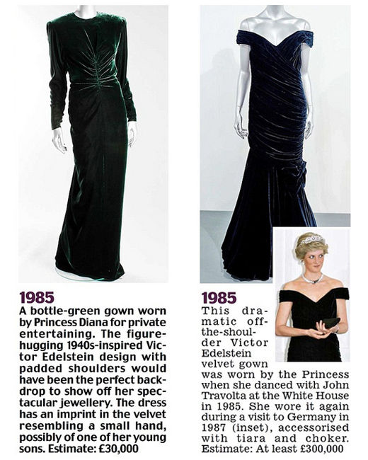 左:Victor Edelstein綠色天鵝絨禮服。1985年出席私人聚會(huì)時(shí),戴安娜王妃穿著這條禮服。估價(jià):3萬英鎊