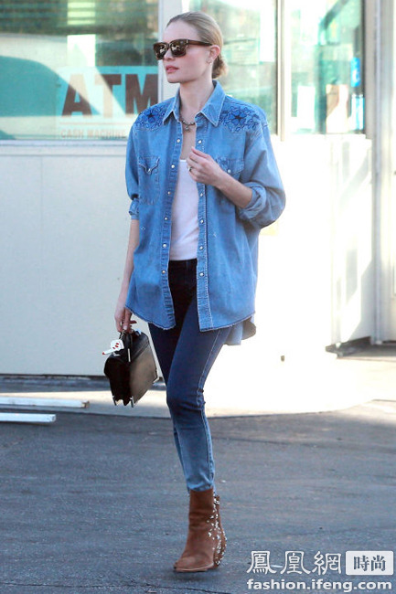 這一套造型讓牛仔成為主導(dǎo),Oversize的男孩式牛仔襯衫外套最能凸顯帥氣的Boy風(fēng)格,而和牛仔藍(lán)色最百搭的棕色系點(diǎn)綴其中,瘦腿的牛仔褲和上身形成強(qiáng)烈視覺對(duì)比,哪怕是披發(fā),也照樣酷勁十足!