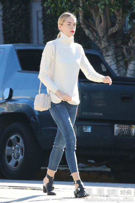 淺色系的針織衫是春季必備的單品,搭配牛仔和珍珠耳環(huán)絕對(duì)讓你立顯優(yōu)雅和氣場,緊身的牛仔褲關(guān)鍵在于七分長度剛剛好,一雙尖頭的高跟涼鞋讓美腿盡現(xiàn),整體造型簡潔又時(shí)髦!