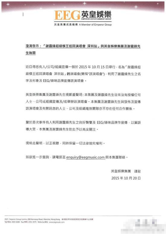 謝霆鋒經(jīng)紀(jì)人霍汶希表示“本集團(tuán)及謝霆鋒先生從來(lái)沒(méi)有授權(quán)任何人士、公司或組織宣傳或舉辦該演唱會(huì)。本集團(tuán)及謝霆鋒先生于發(fā)布及宣傳該演唱會(huì)及有關(guān)訊息的人士、公司及組織毫無(wú)關(guān)系,不存在任何合作關(guān)系。”以免粉絲受騙,同時(shí)保留一切法律追究權(quán)利。