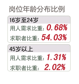 45歲以上年齡段,單位用人的需求比重為1.31%,求職者比重為2.02%。