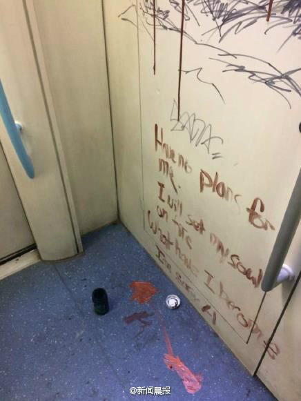 本整潔的地鐵車廂內(nèi)壁,被畫上了“半裸人體”的涂鴉,還用紅色顏料配上了酷似流血的圖案,看起來頗觸目驚心。