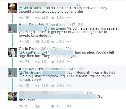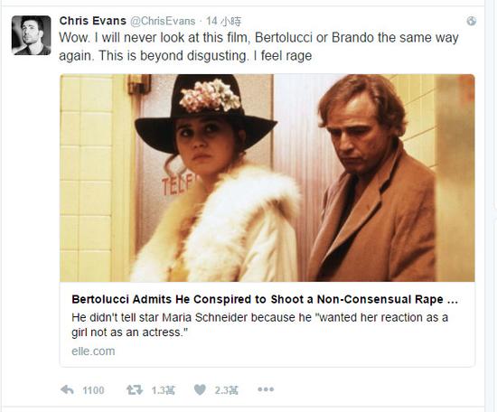 《美國隊長》克里斯·埃文斯(Chris Evans)也表示:“天啊,我再也無法像過去那樣看待這部片子、貝托魯奇或白蘭度,這已經超越了惡心,我覺得很憤怒!”他的發(fā)文也引來許多網友認同,連《歌喉贊》女主角安娜·肯德里克(Anna Kendrick)也在底下回應表示,“施耐德女士之前曾在訪談中說過,‘我曾提起過這件事情,聽的人(男人們)還翻白眼’。”