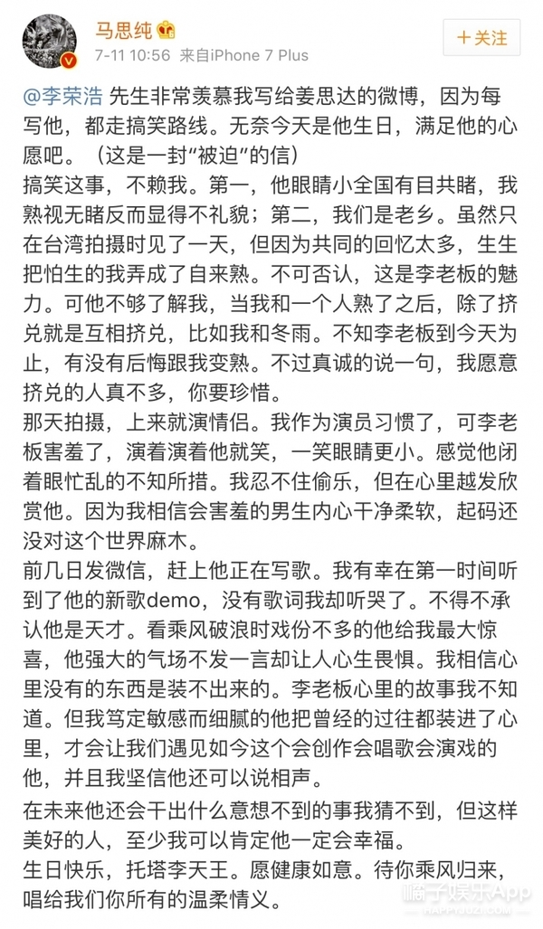 原來是因?yàn)轳R思純?cè)谖⒉懥艘环忾L信祝福李榮浩的生日,她還調(diào)侃這是一封“被迫”的信。