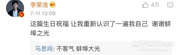 隨后李榮浩就在底下評(píng)論說馬思純的這篇生日祝福讓他重新認(rèn)識(shí)了自己,還稱她為“蚌埠之光”。而馬思純也回復(fù)他說“不客氣,蚌埠大光。”