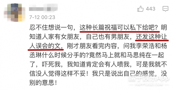 然而,評(píng)論的畫風(fēng)走向有點(diǎn)讓人意外。不少網(wǎng)友認(rèn)為馬思純有歐豪了,李榮浩也有楊丞琳了,這種長文祝福信不應(yīng)該公開發(fā)↓