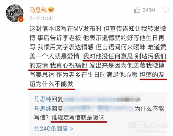 馬思純?cè)诮裉炝璩康臅r(shí)候發(fā)了一條評(píng)論解釋說這是李榮浩讓她寫的,她只是真心祝福他的生日,對(duì)他沒有任何意思,兩人的友情坦坦蕩蕩的。