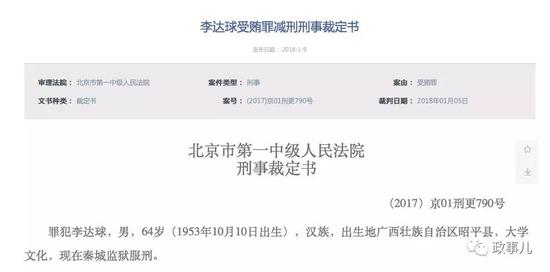 1月9日,北京市法院審判信息網(wǎng)公布了李達(dá)球受賄罪減刑刑事裁定書(shū),他被減去有期徒刑7個(gè)月。