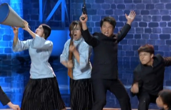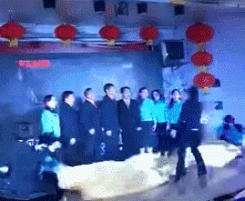節(jié)目中參賽選手伴著《黃河大合唱》的背景音樂(lè),做出一些夸張另類(lèi)的肢體動(dòng)作,當(dāng)時(shí)這段表演引得現(xiàn)場(chǎng)四位評(píng)委大笑,并獲得全票通過(guò)。